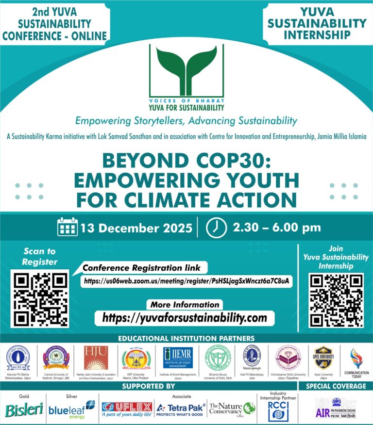 After the stupendous success of the 1st Yuva Sustainability Conference, Voices of Bharat: Yuva for Sustainability is ready with its second edition. The 2nd Yuva Sustainability Conference builds on the themes and gaps of the recently held COP30 and evaluates them from the perspective of youth communicators. The conference brings together industry leaders and youth participation to discuss climate action outside COPs, the role of youth in climate action, youth @COP30 and beyond, etc.