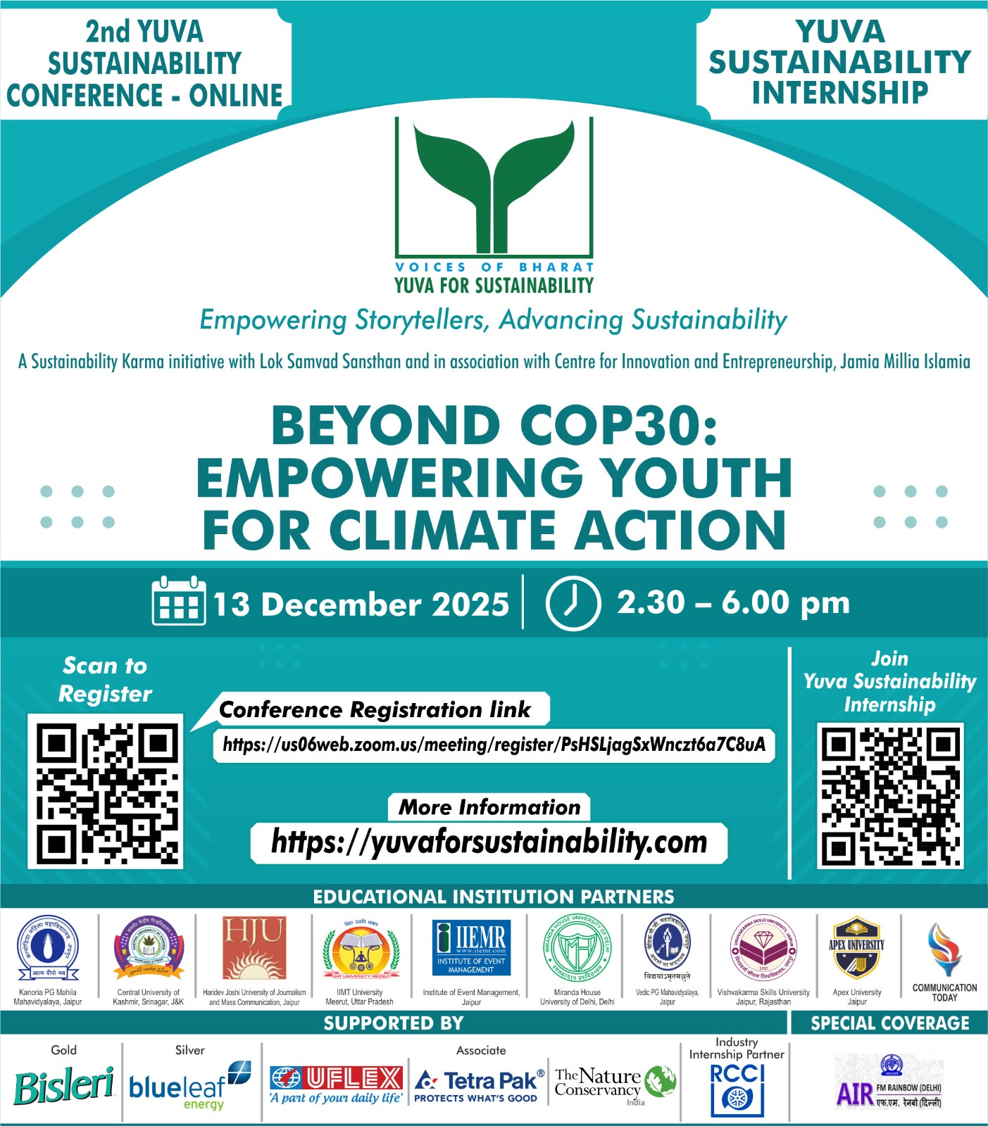 Building on the ongoing the discourse, we are organising an online conference on the theme “Beyond COP30: Empowering Youth for Climate Action” under Voices of Bharat: Yuva for Sustainability, an initiative of Sustainability Karma with Lok Samvad Sansthan as the implementation partner.